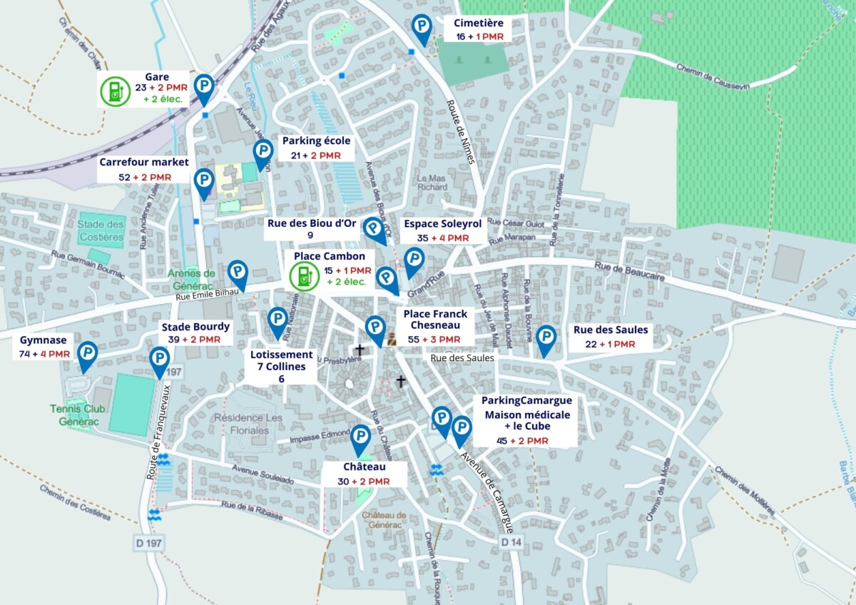 Les parkings, places PMR et bornes de recharge pour véhicules électriques